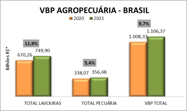 O valor da produção das lavouras foi de R$ 749,9 bilhões e o da pecuária, R$ 356,5 bilhões. As lavouras tiveram crescimento de 11,9% em valores reais, e a pecuária, 5,4%. Os produtos que mais impulsionaram o VBP foram o arroz (3,9%), cana-de-açúcar (4,3%), milho (6,8%), soja (28,5%) e trigo (38,6%).